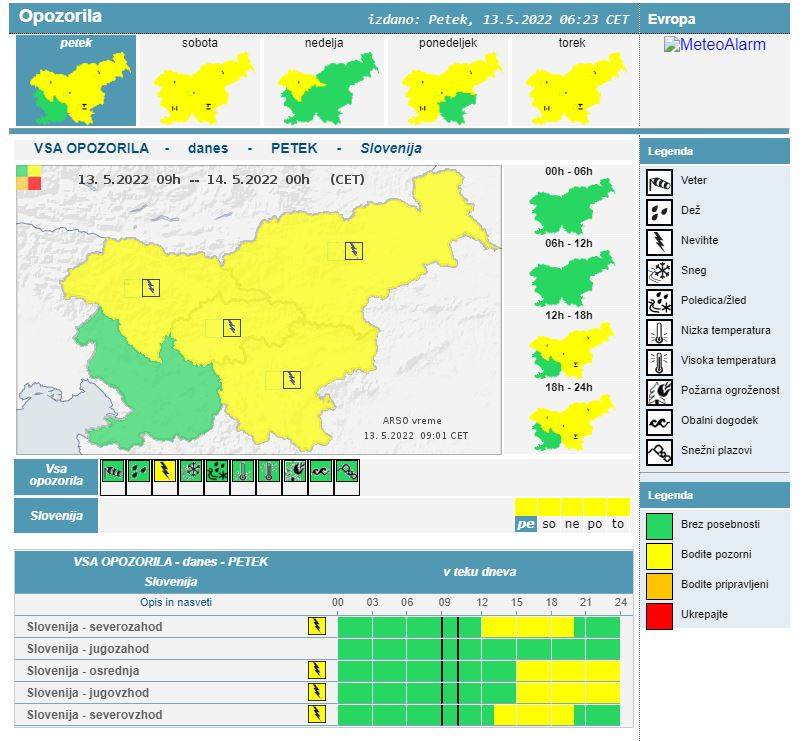 Agencija Republike Slovenije za okolje pa je za danes popoldne že izdala opozorilo pred nevihtami. Tudi vikend in pa začetek prihodnjega tedna naj bi bil v znamenju močnejših ploh in neviht.