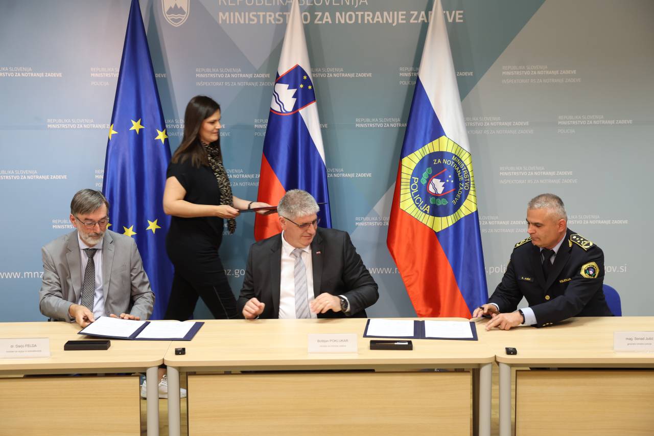 Minister za notranje zadeve Boštjan Poklukar in minister za vzgojo in izobraževanje Darjo Felda ter generalni direktor policije Senad Jušić so podpisali dogovor o protokolu v primeru povečanih varnostnih tveganj na šolah.