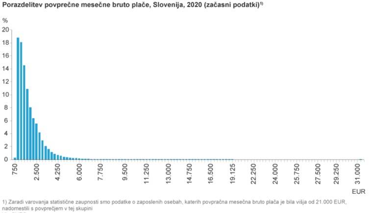 Povprečna mesečna neto plača oseb, zaposlenih v Sloveniji, je v letu 2020 po začasnih podatkih iz omenjene letne strukturne statistike plač znašala 1252 evrov, kar je za 5,4 odstotka več kot v prejšnjem letu.
