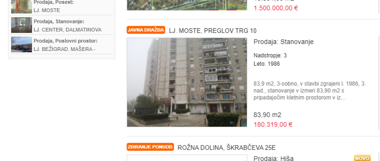 Cena najcenejšega trisobnega stanovanja znaša dobrih 180.000 evrov, izhodiščna cena za dvostanovanjsko hišo v Rožni dolini pa znaša slabih 700 tisočakov.