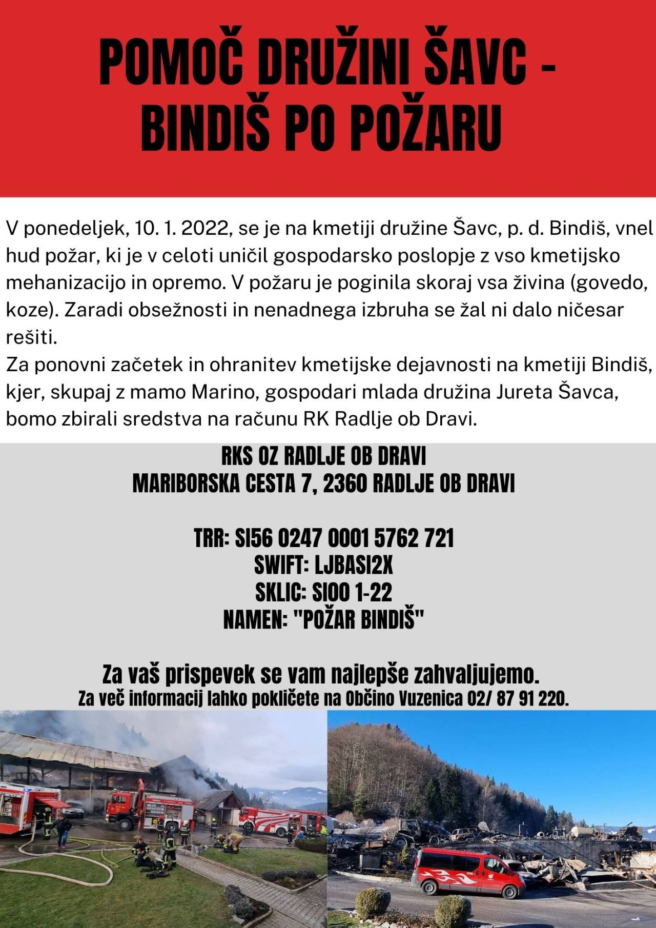 Za ponovni začetek in ohranitev kmetijske dejavnosti na kmetiji Bindiš, kjer skupaj z mamo Marino gospodari mlada družina Jureta Šavca, bo občina zbirala sredstva na računu Rdečega križa Radlje ob Dravi.