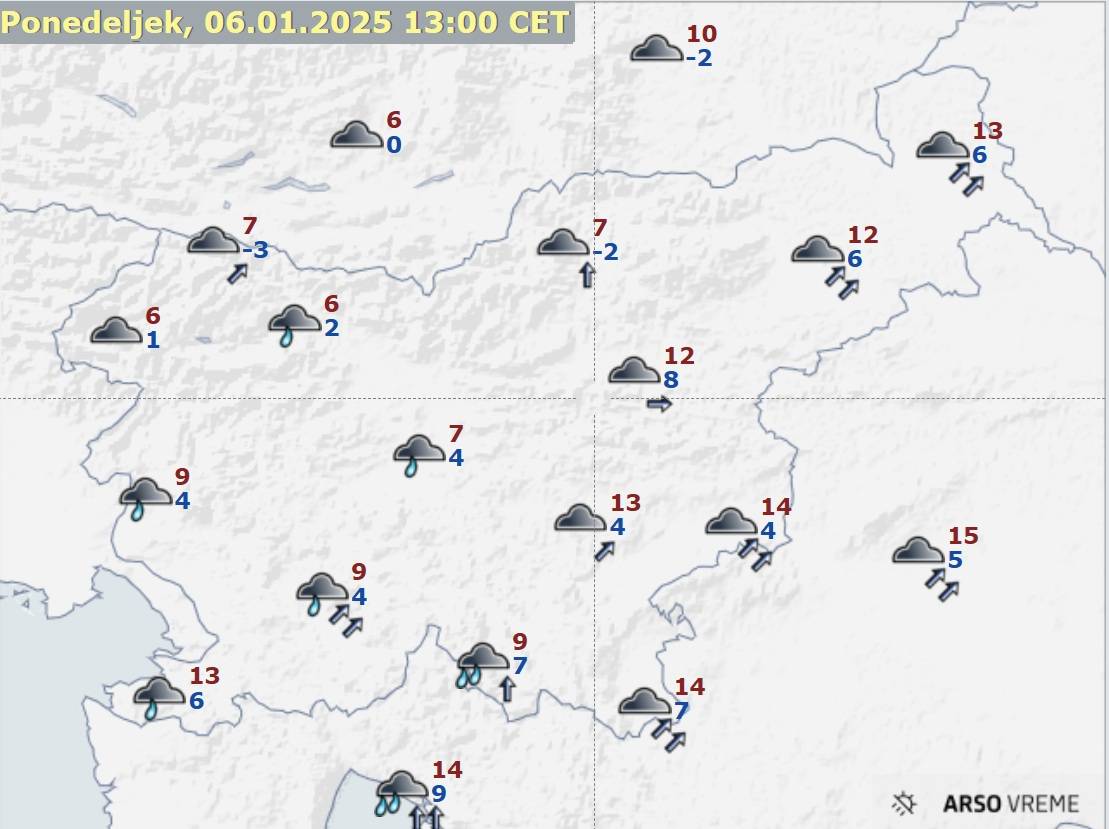 V ponedeljek bo pretežno oblačno, predvsem v zahodni in južni Sloveniji bo občasno rahlo deževalo. Pihal bo zmeren do močan jugozahodnik. Najnižje jutranje temperature bodo od 0 do 7, v prevetrenih krajih od 7 do 12, najvišje dnevne od 8 do 14, na severozahodu okoli 6 stopinj Celzija.
