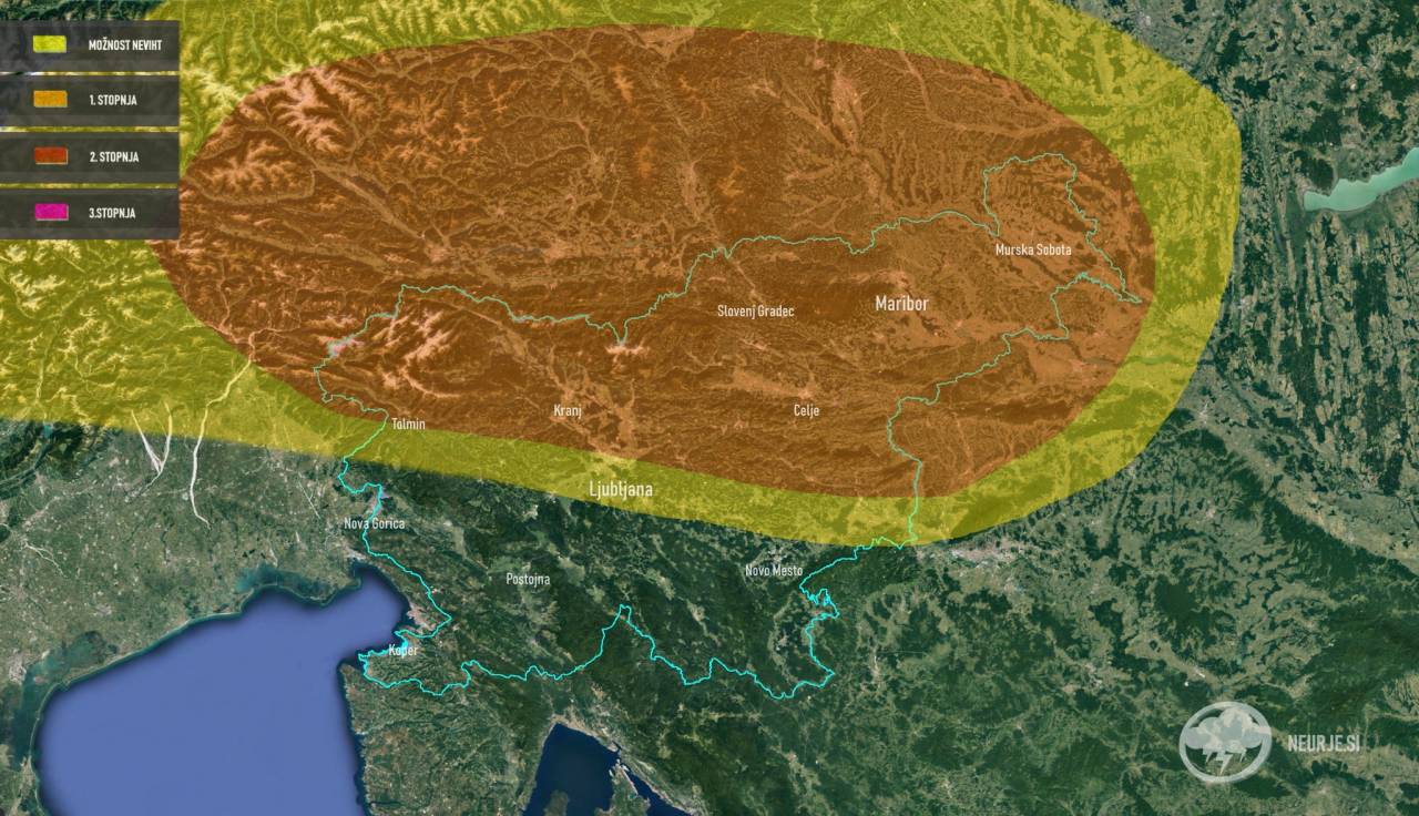 Na območju, označenim z oranžno barvo, je povečana grožnja neviht z močnejšimi nalivi, silovitim vetrom, v nekaterih krajih je možna tudi toča, svarijo na Neurje.si