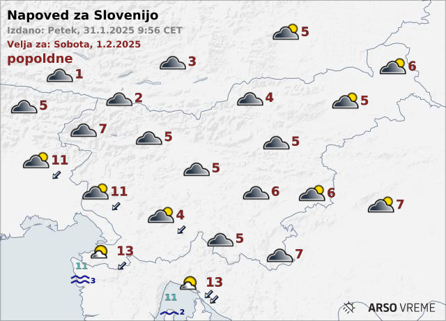 V soboto bo pretežno oblačno, padavine bodo dopoldne postopno ponehale. Na Primorskem bo pihala večinoma šibka burja. Najnižje jutranje temperature bodo od 0 do 4, na Primorskem do 8, najvišje dnevne od 2 do 7, na Primorskem do 13 stopinj Celzija, napovedujejo vremenoslovci Agencije Republike Slovenije za okolje.