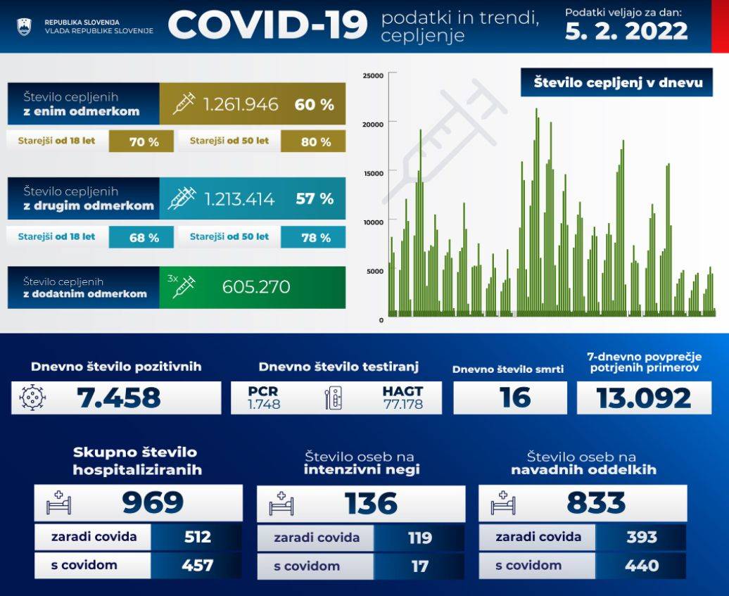 Na intenzivni negi je tako 119 bolnikov zaradi covida, 17 oseb pa s covidom in zaradi drugih stanj. Na navadnih oddelkih pa je hospitaliziranih 393 bolnikov zaradi covida, 440 posameznikov pa s covidom.