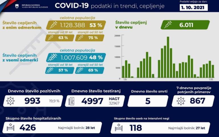 V Sloveniji so včeraj, 1. oktobra, opravili 4997 PCR testiranj na koronavirus in potrdili 993 novih okužb, gre za 19,9-odstotni delež okužb.