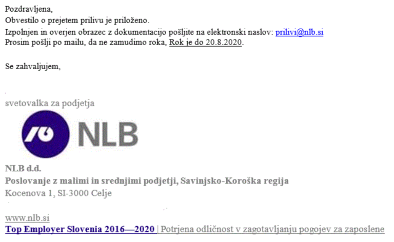 Podjetja, ki so prejela zlonamerno elektronsko sporočilo s strani pošiljatelja, ki se lažno predstavlja v imenu svetovalke za podjetja iz NLB d.d., banka svetuje, da priponke ne odpirajo, podatkov v obrazec ne vnašajo in tovrstno sporočilo nemudoma pobrišejo.