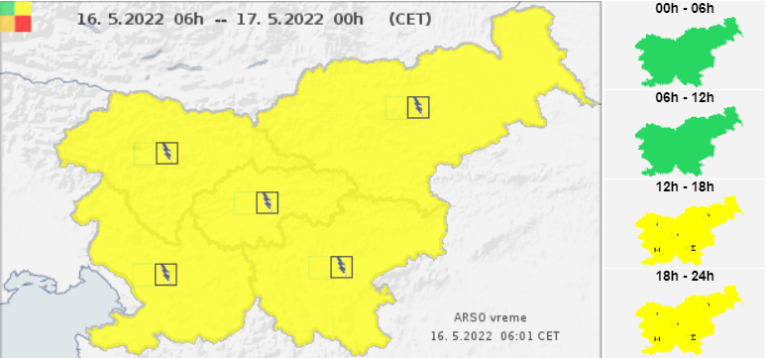 Po celotni Sloveniji je nevarnost hujših neviht. Lokalno so možni močnejši nalivi, piš vetra in udari strel. Hitro pa lahko narastejo tudi hudourniški vodotoki.