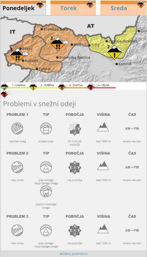 V visokogorju nad okoli 1800 metrov je trenutno znatna nevarnost snežnih plazov, tretje stopnje, nižje pa zmerna, druge stopnje.