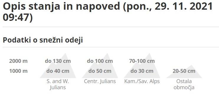 Agencija Republike Slovenije za okolje poroča, da je največ snega na avtomatski postaji Kanin okoli 160 centimetrov, na Zelenici 110 centimetrov, Kredarici sto centimetrov, Voglu 90 centimetrov, Rudnem polju 82 centimetrov, Krvavcu 78 centimetrov, Vršiču in Pavličevem sedlu 69 centimetrov, Planini pod Golico 60 centimetrov.
