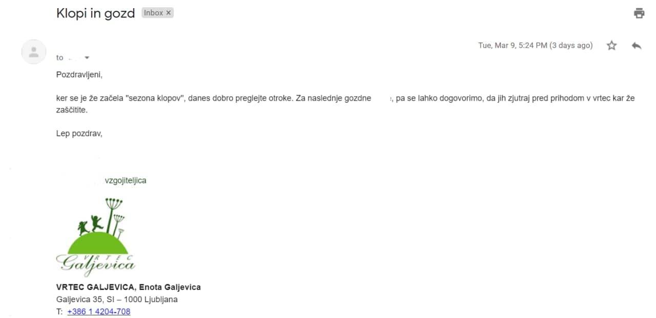 Z dvigom temperatur spomladi se ob cvetlicah počasi prebujajo tudi klopi. V uredništvo smo prejeli obvestilo, da eden izmed ljubljanskih vrtcev že poziva starše, naj pregledujejo svoje otroke, za naslednje gozdne dogodivščine v okviru vrtca pa priporoča, da jih tudi ustrezno zaščitijo.
