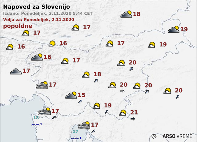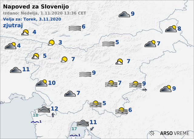 V Ljubljani smo se prebudili v megleno ponedeljkovo jutro, a kmalu je posijalo sonce. Najvišje dnevne temperature bodo od 16 do 21 stopinj Celzija. Čez dan bo ponekod pihal jugozahodni veter. Jasno vreme se bo nadaljevalo tudi v torek. Zjutraj in dopoldne bo ponekod prisotna megla ali nizka oblačnost, ki se bo predvsem na Primorskem zadrževala večji del dneva. Jutranje temperature bodo od 4 do 9 stopinj Celzija, najvišje dnevne pa od 16 do 21 stopinj Celzija.