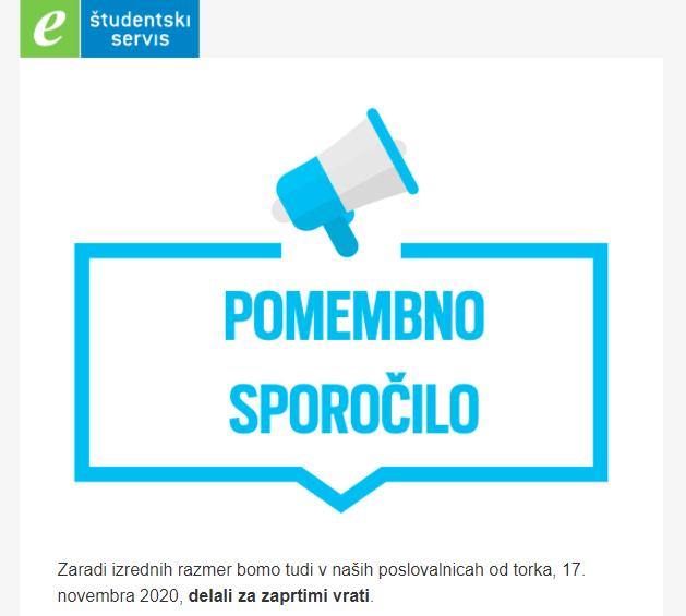 Preverili smo, kako v tem času delujejo študentski servisi, ki so morali s sprejetjem novih ukrepov, zapreti svoja vrata. A kot so nam sporočili z e-Študentskega servisa, popolnoma normalno delujejo za zaprtimi vrati: "Naše delo poteka povsem običajno, le da nimamo poslovalnic odprtih za fizični obisk. Glede na to, da imamo prav vse procese podprte z elektronsko rešitvijo, lahko študenti in podjetja vse v zvezi s študentskim delom uredijo na naši spletni strani. Če se kje zatakne, nas lahko tudi pokličejo, saj naši zaposleni delajo po običajnem urniku."