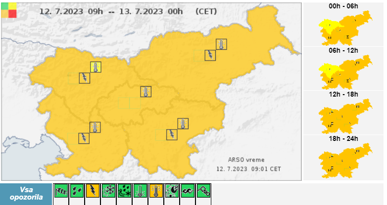 Agencija Republike Slovenije za okolje je zaradi možnosti pojava neviht izdala oranžno opozorilo, sredi dneva in popoldne se po nižinah obeta velika toplotna obremenitev.