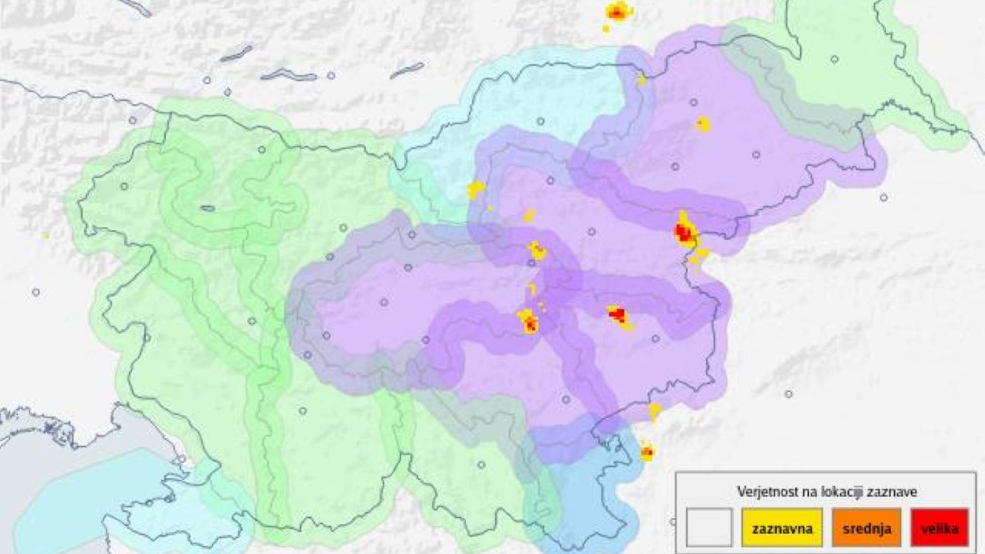 Barve označujejo verjetnost, da se ob prikazanem času na obarvanih lokacijah pojavlja toča: rumena - ZAZNAVNA; oranžna - SREDNJA; rdeča - VELIKA (vir: meteo.si).
