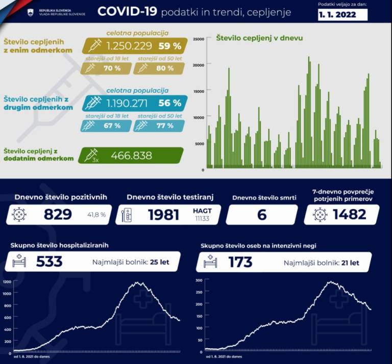V Sloveniji so včeraj, 1. januarja, opravili 1981 PCR testiranj na koronavirus in potrdili 829 novih okužb, gre za 41,8-odstotni delež okužb.
