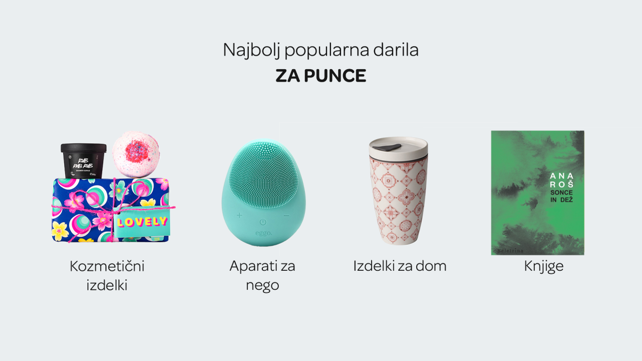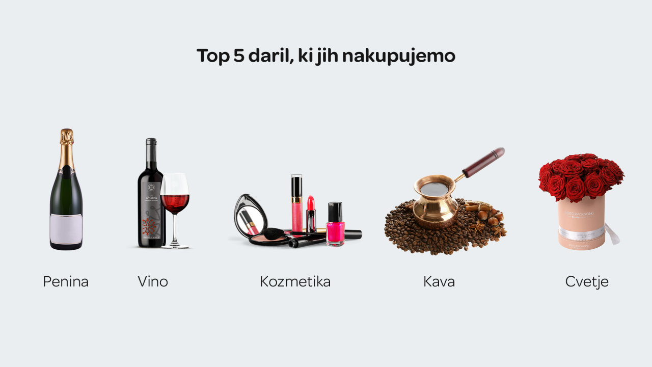 Med najbolj pogosta darila, ki se znajdejo v nakupovalni košarici so penina in vino, kozmetični izdelki, kava ter cvetje.