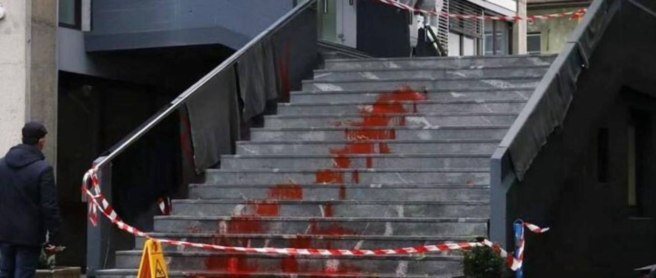 Na vhodu v ljubljansko Fakulteto za strojništvo so včeraj ponoči neznanci stopnice polili z rdečo barvo in ob tem na ograjo prav tako z rdečo napisali »partner genocidu«.