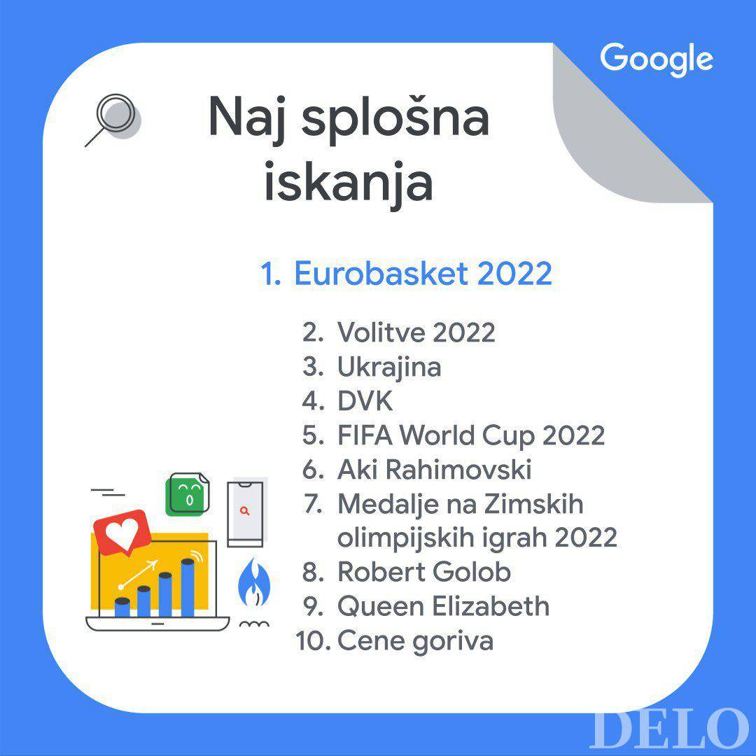 Če je bil prejšnje leto na prvem mestu Covid Sledilnik, je njegovo mesto letos zasedel Eurobasket 2022. Temu sledi iskalni niz Ukrajina, na tretje mesto pa se je uvrstila Državna volilna komisija.