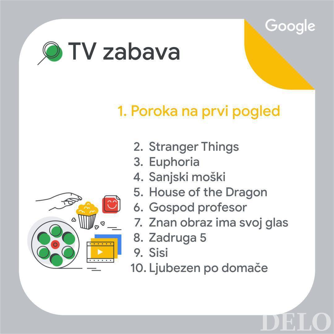 Poglejmo si še področje televizije in zabave. Naše računalnike in mobilne telefone je popolnoma prevzela Poroka na prvi pogled, ki ji na drugem mestu sledi televizijska serija Stranger Things in na tretjem serija Evforija.