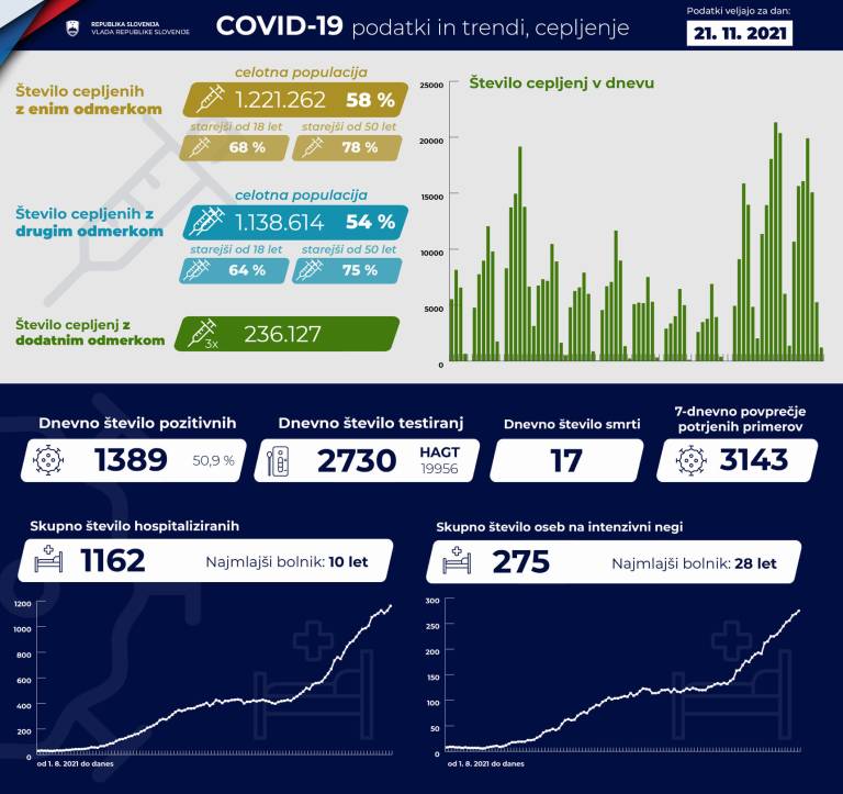V Sloveniji so včeraj, 21. novembra, opravili 2730 PCR testiranj na koronavirus in potrdili 1389 novih okužb, gre za 50,9-odstotni delež okužb.