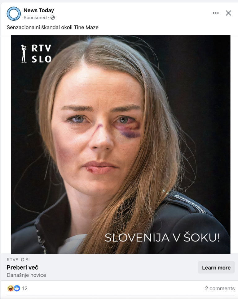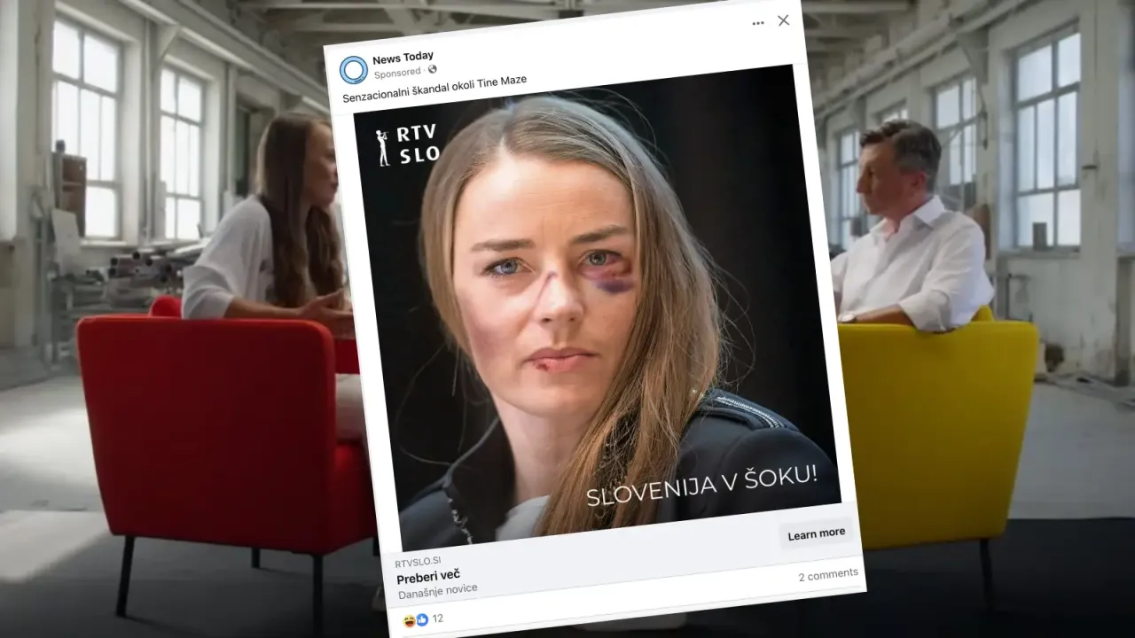 Prevaranti prežijo na nespretne uporabnike na Facebooku, kjer z oglasom, v katerem je z umetno inteligenco prirejena fotografija nekdanje smučarske šampionke z modricami na obrazu ter velikim napisom »SLOVENIJA V ŠOKU!«