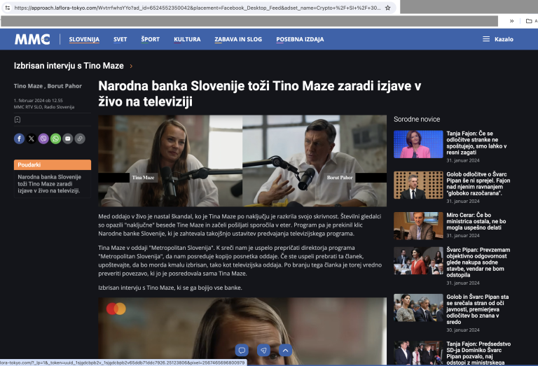 »Senzacionalni škandal okoli Tine Maze,« povezava pa je prikazana, kot da vodi na Rtvslo.si. A povezava dejansko vodi na spletni naslov, na katerem je lažna spletna stran, ki izgleda povsem enako, kot RTV MMC.