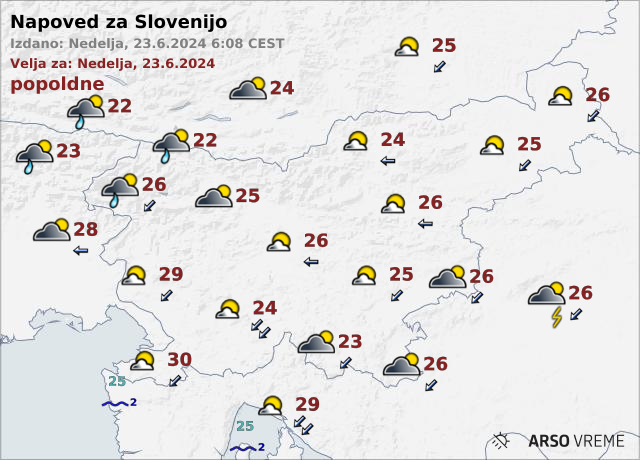 Jutri bo sprva pretežno oblačno, na jugu bo ponekod nekaj padavin. Najnižje jutranje temperature bodo od 14 do 18, najvišje dnevne pa bodo od 22 do 26 stopinj Celzija.