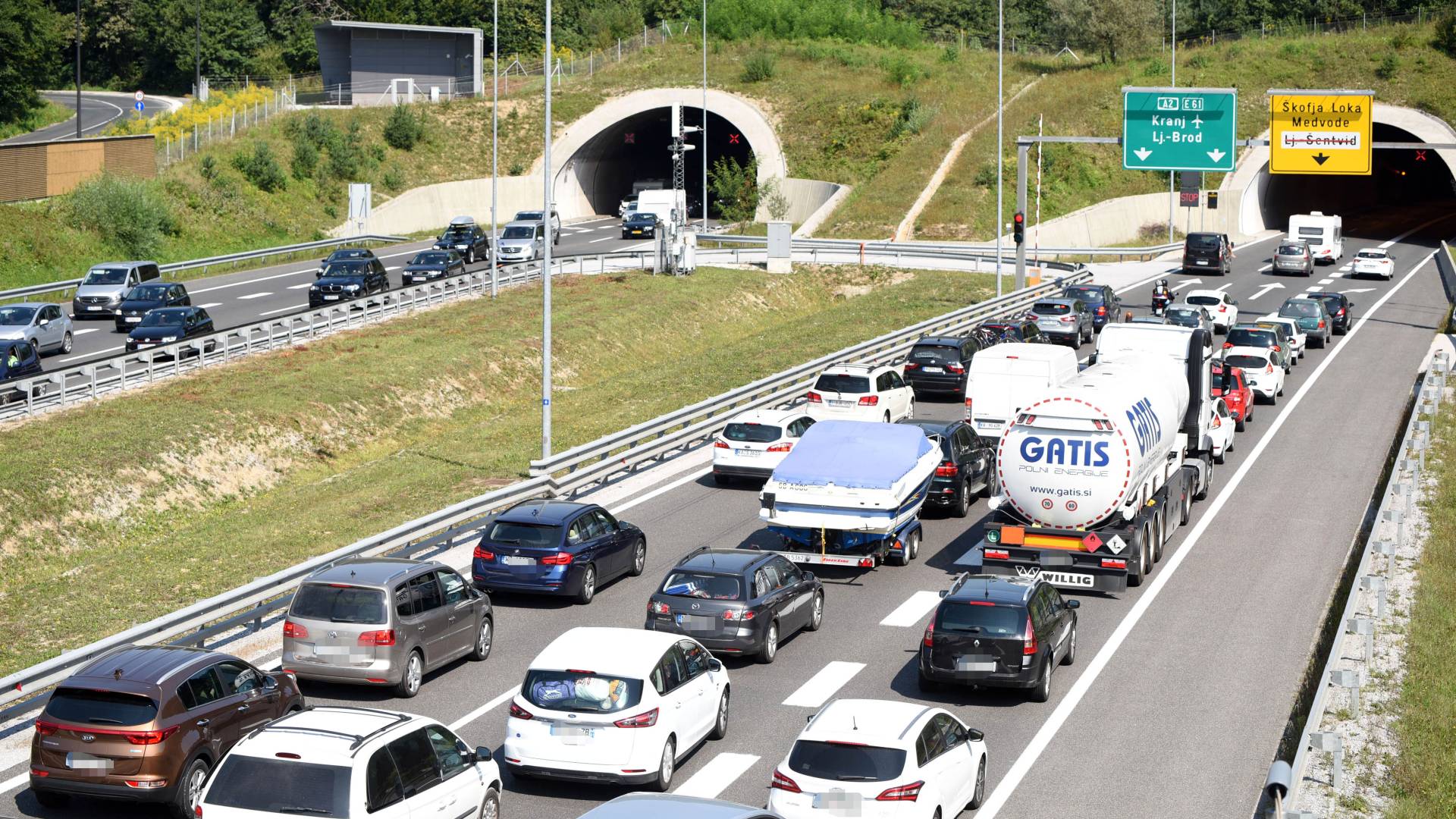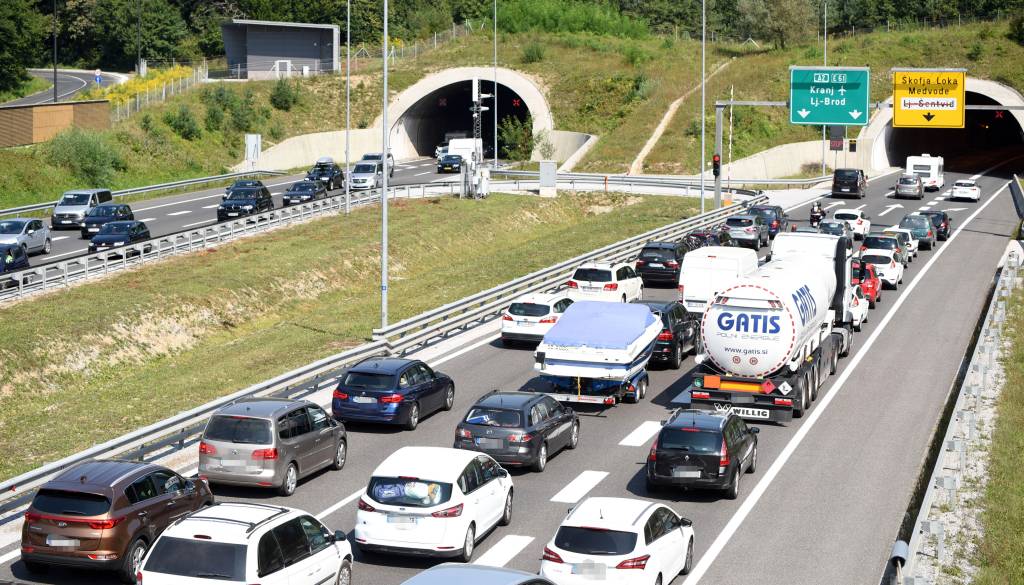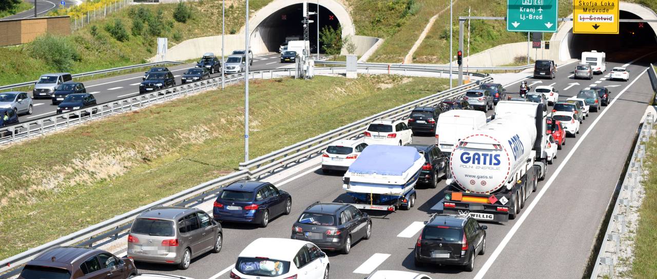 Na gorenjski avtocesti je kolona pred predorom Karavanke proti Avstriji dolga približno tri kilometre.