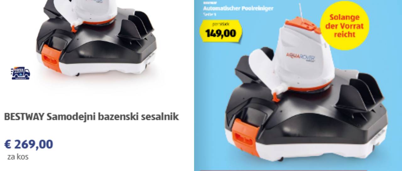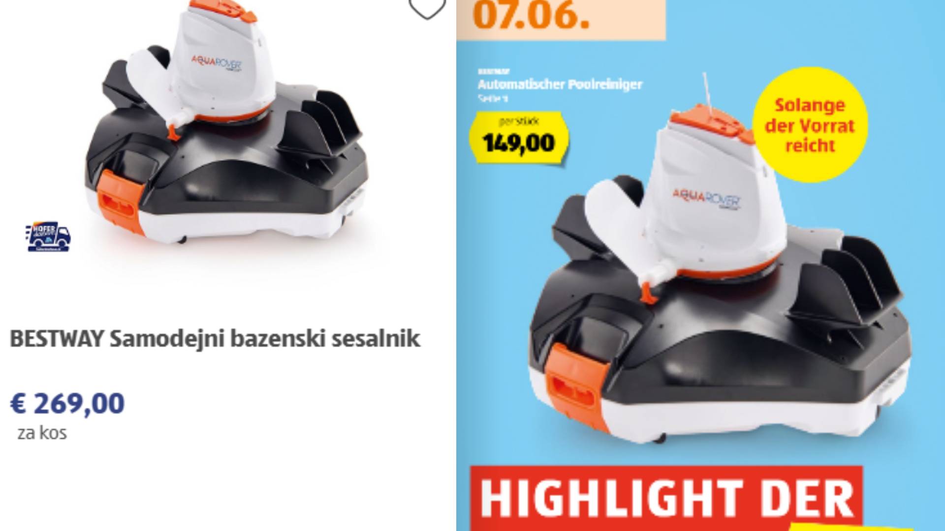 Uporabnik družbenega omrežja TikTok je v videu opozoril na veliko razliko v ceni samodejnega bazenskega sesalnika. Ta v Sloveniji stane 269 evrov, medtem ko je v letaku za avstrijsko tržišče cena enakega sesalnika le 149 evrov