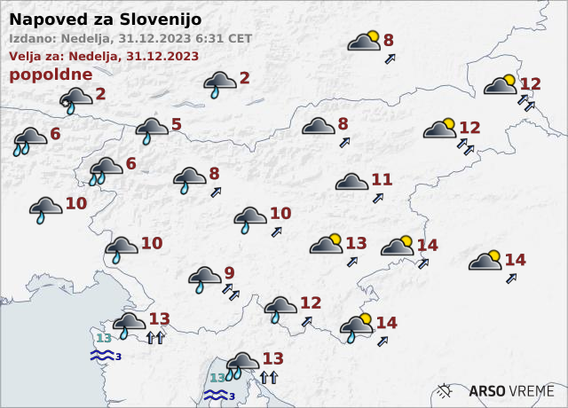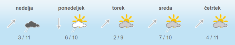 Pihal bo jugozahodni veter, zvečer ob morju okrepljen jugo. Najvišje dnevne temperature bodo od 9 do 14, na severozahodu okoli 5 stopinj Celzija.