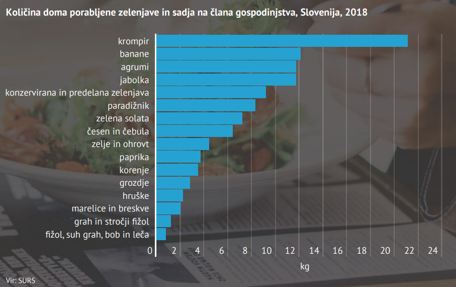Član gospodinjstva v Sloveniji je leta 2018 doma porabil približno 21 kilogramov krompirja, skoraj 12 kilogramov jabolk in nekaj več kot 7 kilogramov zelene solate.