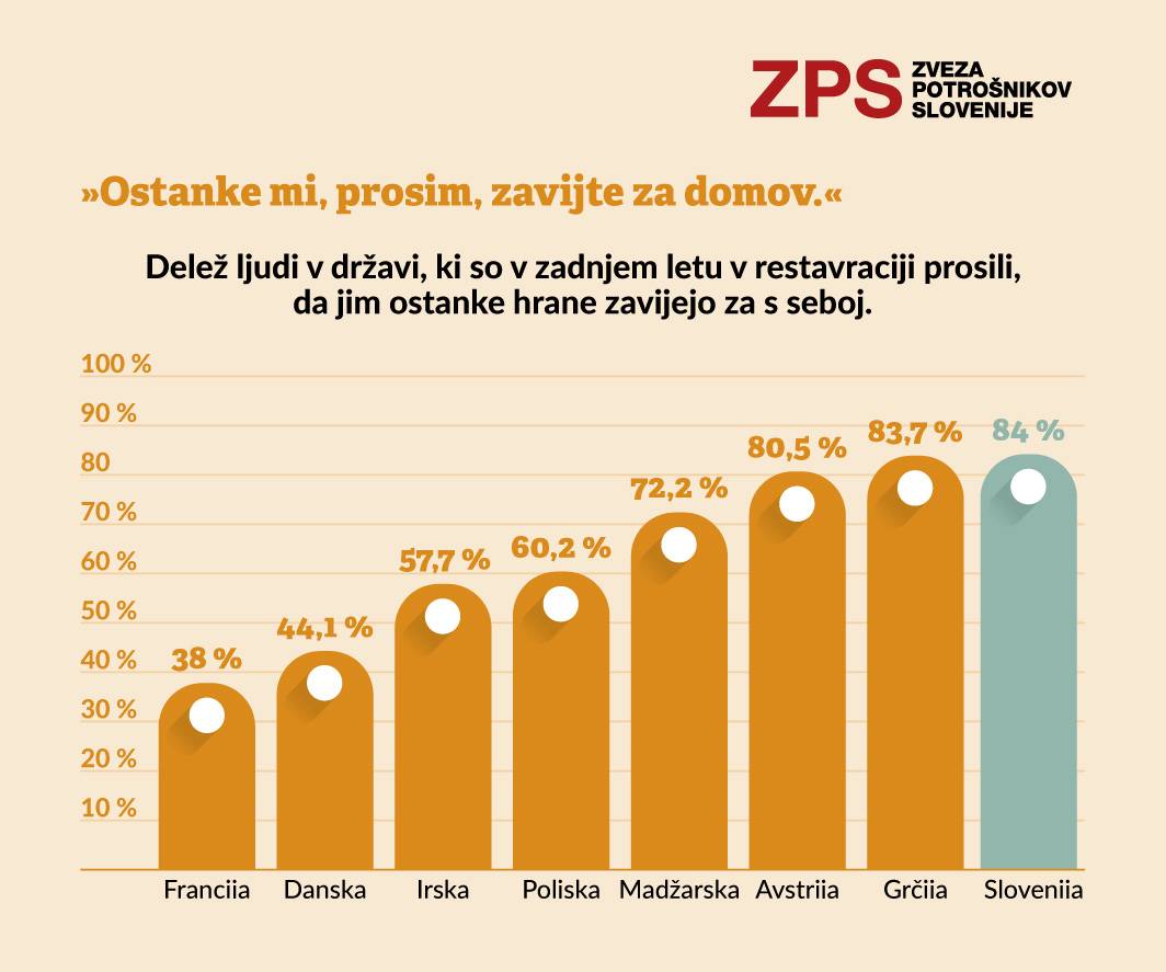EU4Health je v raziskavah ugotovil, da med osmimi državami Francija v restavraciji ne prosi za zavijanje ostankov hrane, najvišji delež pa zaseda Slovenija, ki pa prosi, da si ostanke odnese domov.