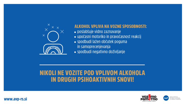 Izmed vseh preminulih v prometnih nesrečah do konca letošnjega oktobra (78 oseb), je kar 27 oseb izgubilo življenje zaradi alkoholiziranega povzročitelja. Tudi alkoholiziranih povzročiteljev smrtnih prometnih nesreč je bilo 27, od tega jih je 22 umrlo v nesreči, ki so jo povzročili. Agencija za varnost prometa opozarja, da pomeni vožnja pod vplivom alkohola neodgovorno izpostavljanje sebe in drugih tveganjem za najhujše posledice.