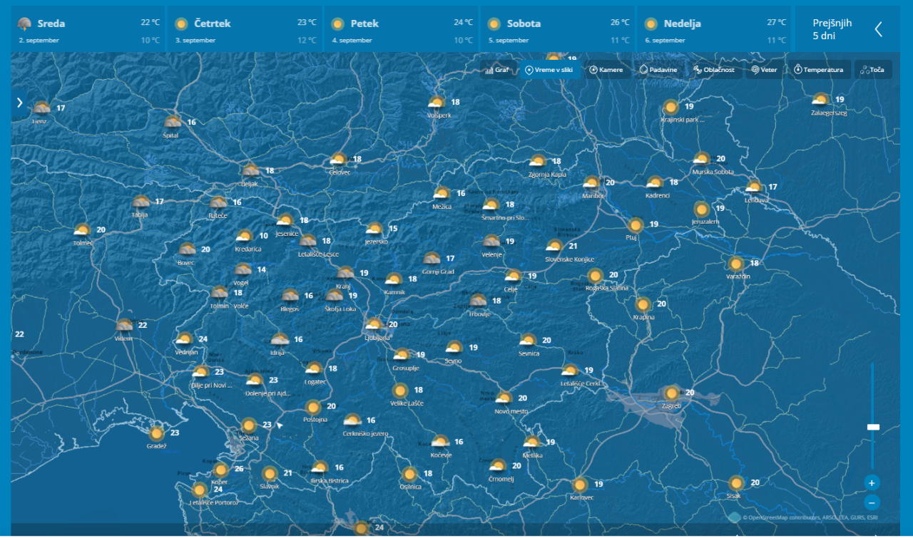 Danes bo povečini sončno, več oblačnosti bo v zahodni Sloveniji. Popoldne in zvečer bodo predvsem v hribovitem svetu zahodne Slovenije možne posamezne plohe ali nevihte. Popoldne bo ob morju zapihal jugo. Najvišje dnevne temperature bodo od 23 do 30 °C.
