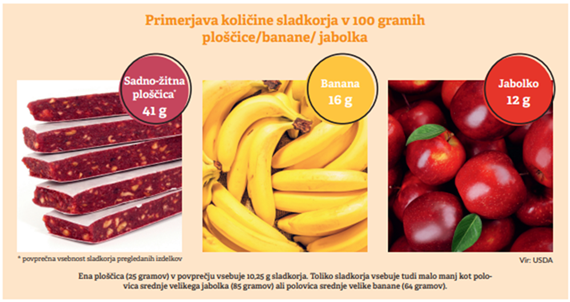 Sadno-žitne ploščice so energijsko zelo bogata živila; na sto gramov namreč v povprečju vsebujejo 373 kilokalorij in 41 gramov sladkorja. Za primerjavo, banane na sto gramov vsebujejo zgolj 16 gramov sladkorja, jabolka pa 12 gramov. Prekomerno uživanje energetsko zelo bogate hrane naj bi v otroštvu povečalo tveganje za debelost.