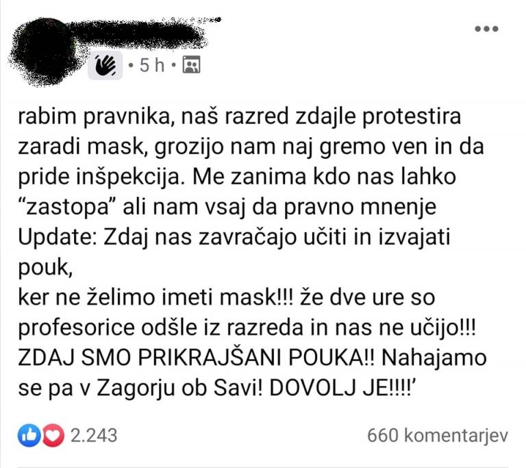 Dijaki naj bi se uprli nošenju zaščitnih mask, učitelji pa naj bi jim zato grozili z inšpekcijo. Zaradi upora naj bi učitelji prenehali s poukom. Zdaj učenci iščejo pravnika, ki bi jim pomagal razrešiti nesporazume, so zapisali na Facebook profilu.