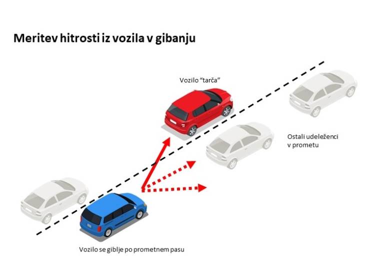 »Tovrstne meritve se imenujejo meritve iz premične točke, ker je potrebno pri meritvah upoštevati in izmeriti hitrosti vozila, kjer je merilnik hitrosti vgrajen. Slednje pomeni, da moramo v postopku odobritve tipa preskusiti večje število prometnih situacij, kot pri običajnih merilnikih hitrosti, ki so nameščeni fiksno nameščeni v ohišja ob voznih pasovih oziroma nad cestiščem.