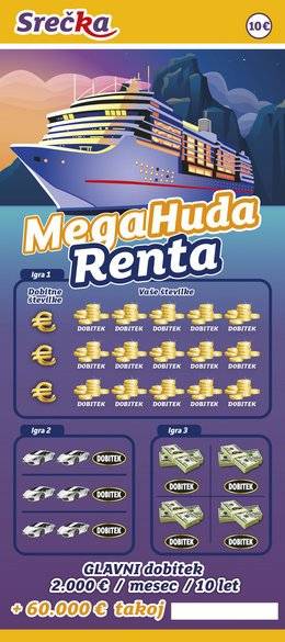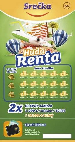 Srečka Huda Renta prinaša 10.000 evrov takoj in 1.000 evrov mesečne rente, srečka Mega Huda Renta pa kar 60.000 evrov takoj in 2.000 evrov mesečne rente.