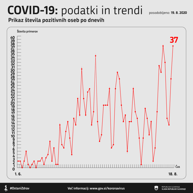 Včeraj, 18. avgusta 2020, so v Sloveniji opravili 1.092 testiranj na novi koronavirus. Potrdili so 37 novih okužb s koronavirusom.