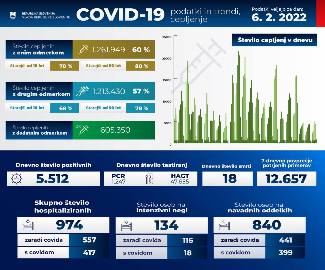 Po zadnjih podatkih je zaradi covida hospitaliziranih 557 bolnikov, s covidom oziroma drugih bolezni pa 417 bolnikov.