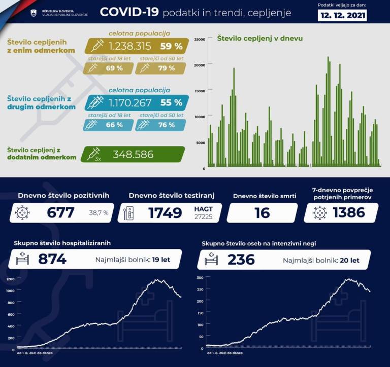 V Sloveniji so včeraj, 12. decembra, opravili 1749 PCR testiranj na koronavirus in potrdili 677 novih okužb, gre za 38,7-odstotni delež okužb.
