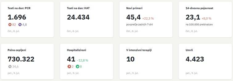 V Sloveniji so včeraj, 8. julija, opravili 1696 PCR testiranj na koronavirus in potrdili 82 novih okužb, gre za 4,8-odstotni delež okužb.