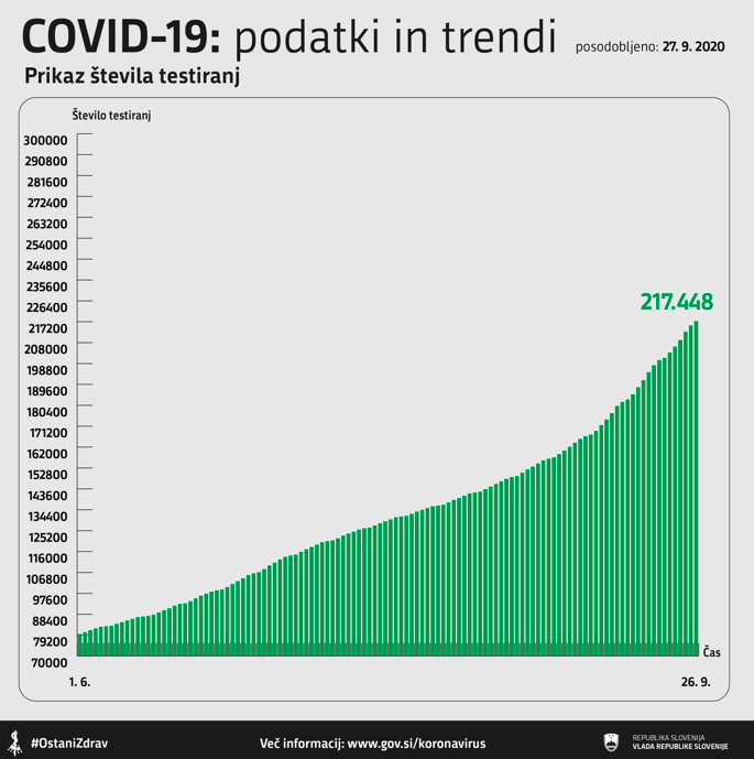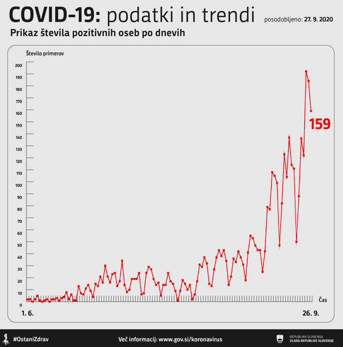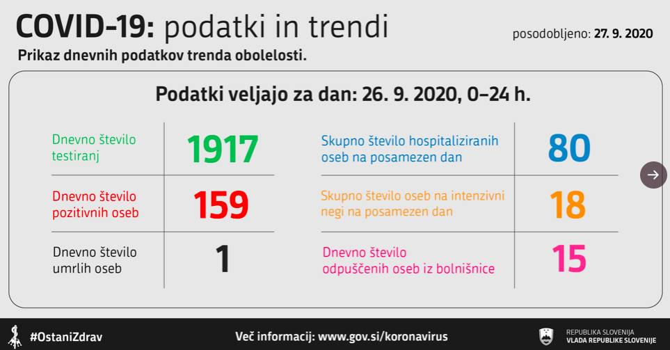 Včeraj, 26. septembra 2020, so v Sloveniji opravili 1917 testiranj na novi koronavirus. Potrdili so 159 novih okužb.
