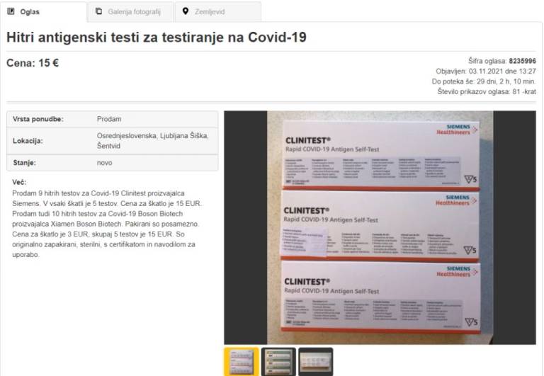 Na strani spletnega oglasnika Bolha.com lahko najdemo več oglasov, v katerih uporabniki prodajajo hitre antigenske teste za testiranje na covid-19.