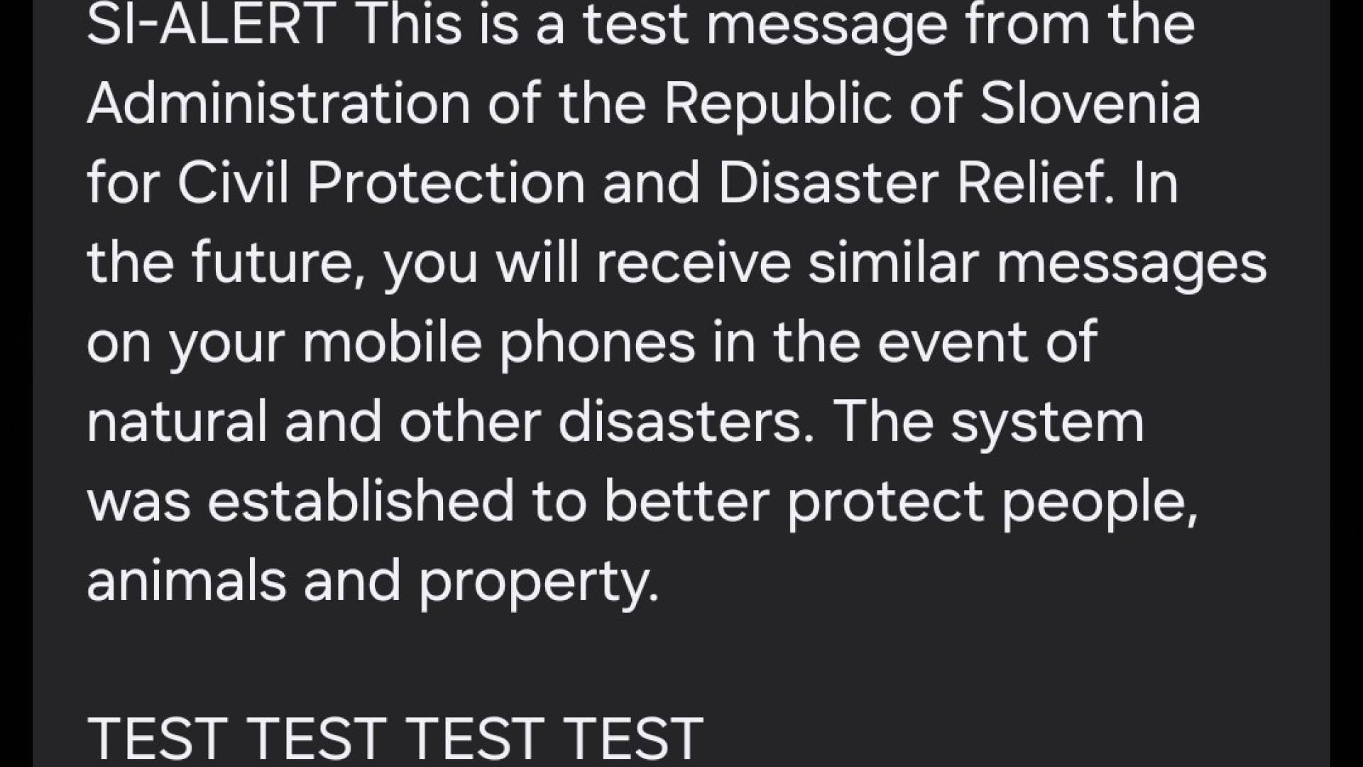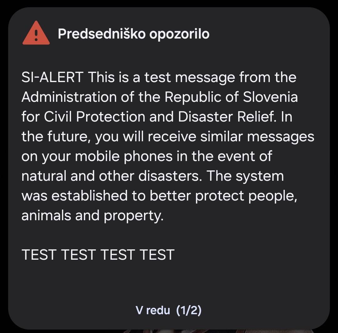 »To je testno sporočilo Uprave Republike Slovenije za zaščito in reševanje. Na enak način boste v prihodnje na mobilne telefone prejemali sporočila v primeru naravnih in drugih nesreč.