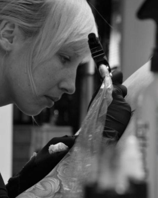 Pravi, da najraje tetovira črno-bele linijske tetovaže, njena strast pa so predvsem tetovaže čipk.
