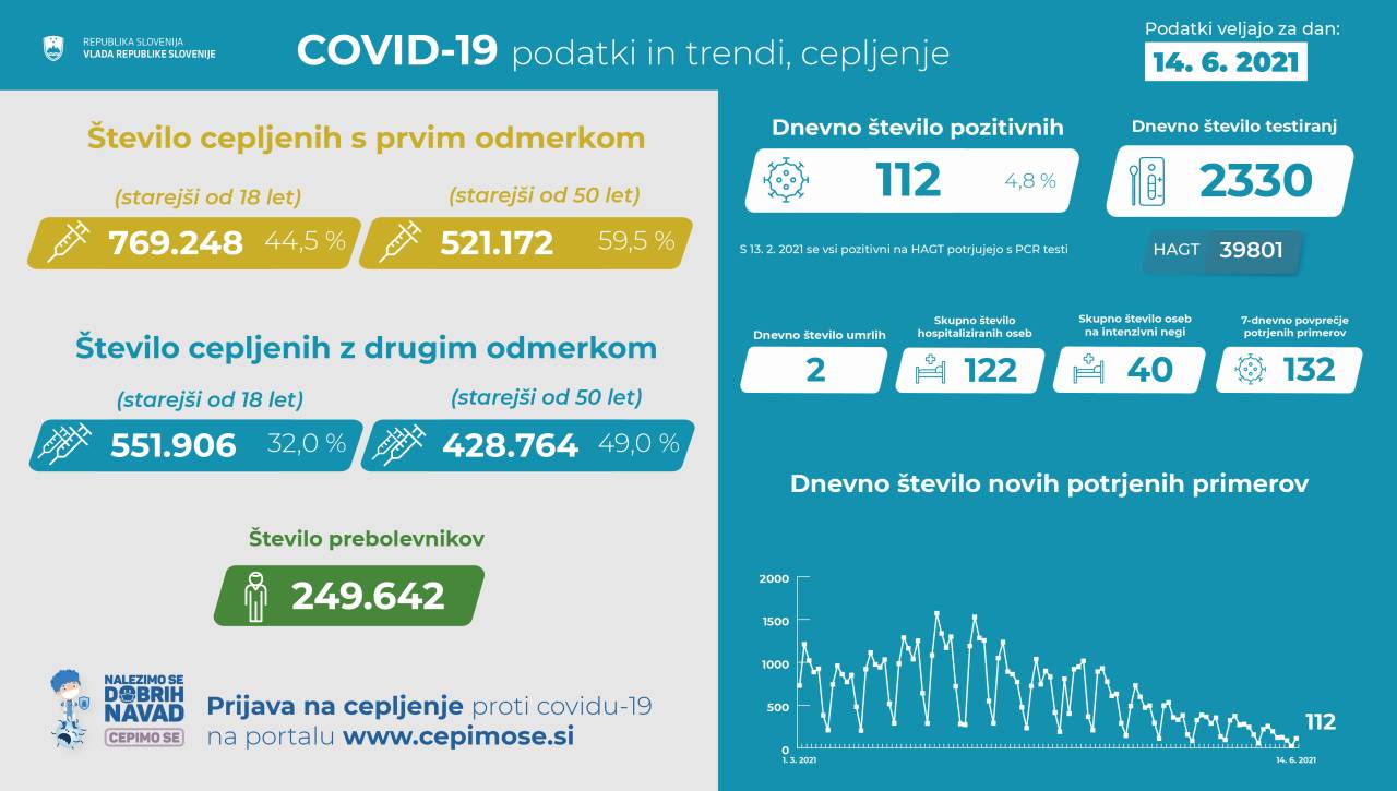 V Sloveniji so včeraj, 14. junija, opravili 2330 PCR testiranj na koronavirus in potrdili 112 novih okužb, gre za 4,8-odstotni delež okužb.