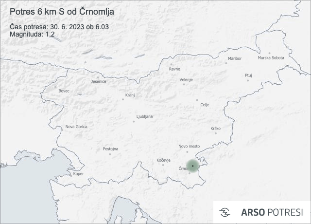 Seizmografi državne mreže potresnih opazovalnic so danes zjutraj, ob 6.03, zabeležili potres magnitude 1,2 v bližini Črnomlja, 71 kilometrov jugovzhodno od Ljubljane.