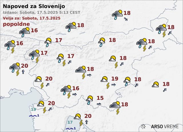 Državni meteorologi napovedujejo, da bo danes spremenljivo do pretežno oblačno. Popoldne bodo nastale krajevne plohe in posamezne nevihte, kakšna bo zlasti na zahodu možna tudi v noči na nedeljo. Zapihal bo jugozahodnik.